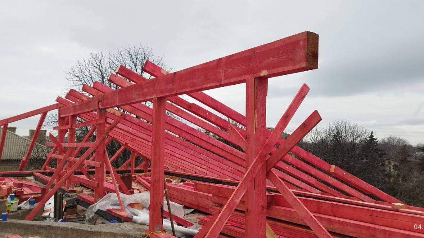 Уточняется, что строители демонтируют подсыпку на чердаке, выполняют работы по устройству полов и снимают старую кровлю. Параллельно идет монтаж новой стропильной системы, а также обустройство навеса над входом в здание.
